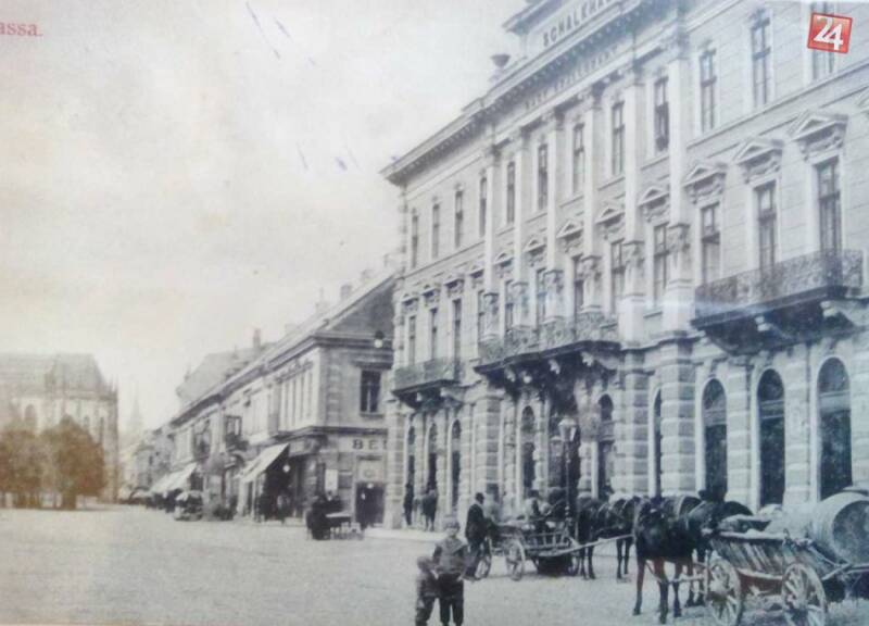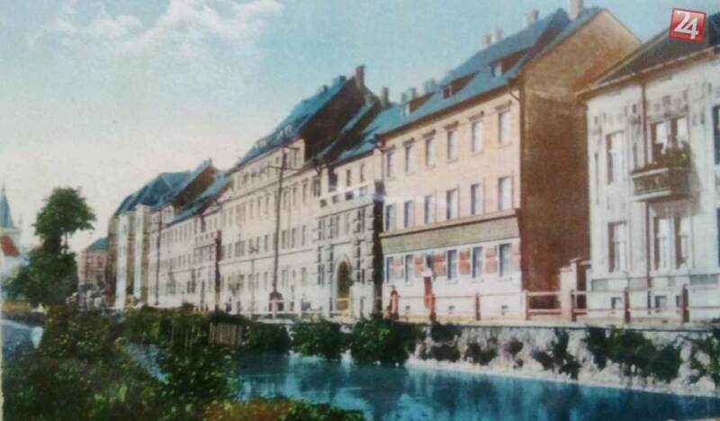 Jakabov palác a rieka Hornád, ktorá tiekla cez mesto Košice ( dnes je tam cesta s autami a rieka tam už netečie ).